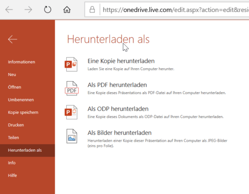 Créer un nouveau fichier dans PowerPoint Online permet aussi de le stocker sur Microsoft OneDrive, le service cloud gratuit. Depuis le menu « Télécharger sous », il est possible d’enregistrer sa présentation localement, de l’exporter en PDF, au format ODP (pour OpenOffice ou LibreOffice), ou de sauvegarder chaque diapositive en JPG.